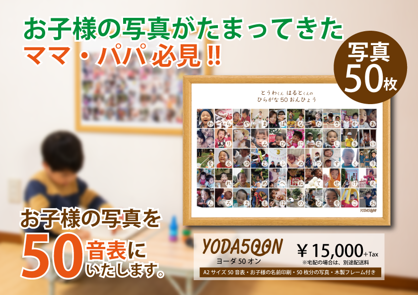 ヨーダ50オンは、ひらがなの50音表にお子様の画像を入れた 「オリジナルの50音表」になります。 お子様との思いでの詰まった50音表でひらがなを教えてあげてはいかがでしょうか。